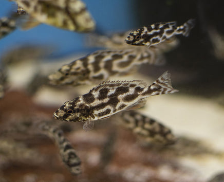 A laterally compressed fish with a large mouth. Maximum reported length of male fish in the wild is 25 centimetres (9.8 in) TL while females reach 20 centimetres (7.9 in) TL. Colouration variable but typically mottled brown and white. The dorsal fin may also show blue coloration while maintaining an orange to red band and sometimes a white line. Adult males frequently "color up" in response to changing conditions and rapidly change from spotted camouflage to brilliant blues and greens and may even exhibit a pale golden tone. Breeding males turn a dark blue which almost completely obscures their blotched pattern. The anal fin is usually orange to red. Females are similar, but usually lack the yellow "egg spot" markings on the anal fin. Juveniles display a brown and white spotted pattern.