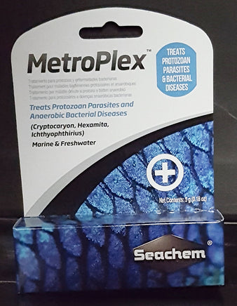 MetroPlex™ is an effective and safe treatment for several protozoan and anaerobic bacterial diseases of fish (Cryptocaryon, Hexamita, Ichthyophthirius). It does not adversely affect the filter bed and is easily removed with carbon. There is little danger of overdosing. Usual dose is 125 mg/10 gallons.